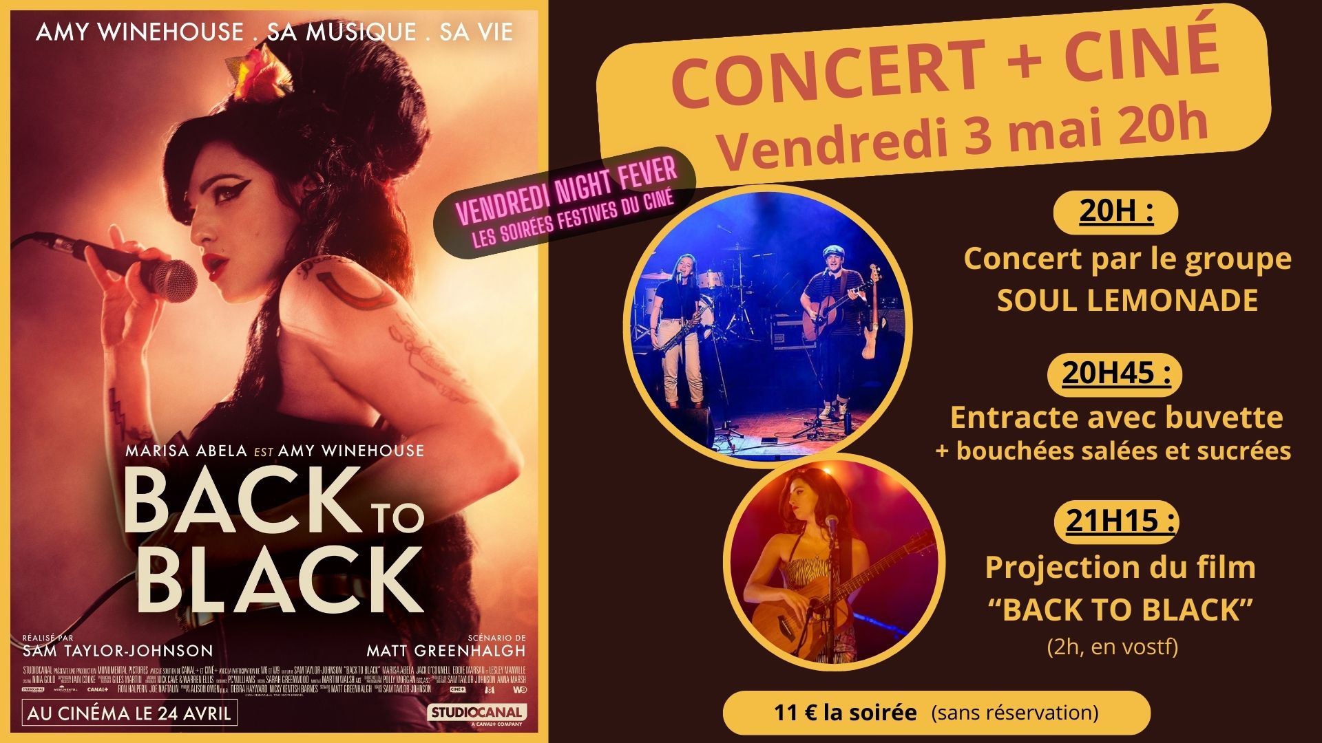 Découvrez le groupe Soul Lemonade en concert suivi de la projection du biopic « Back to black » dédiée au parcours de la chanteuse Amy Winehouse. Un entracte avec buvette et bouchées salées et sucrées sera proposé entre le concert et le film.